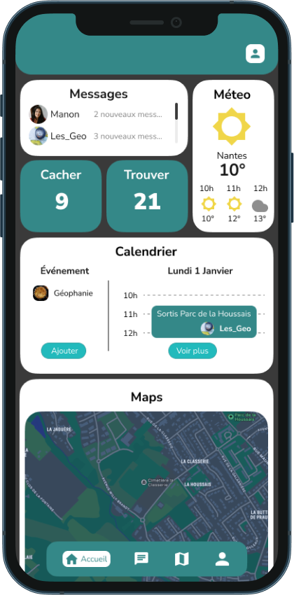 Pour notre nouvelle interface, nous avons choisi de créer une section dédiée aux adultes et une autre aux enfants. Les deux interfaces se ressemblent, mais chacune a sa propre palette de couleurs. L'interface pour enfants est considérablement simplifiée et ne contient pas toutes les fonctionnalités. Dans l’interface pour adulte on peut y retrouver: un accueil avec la météo et la température, une messagerie qui permet aux parents d’organiser des sorties entre eux mais aussi un calendrier et enfin des “Connaissances” que l’ont gagne a chaque cache trouvé.